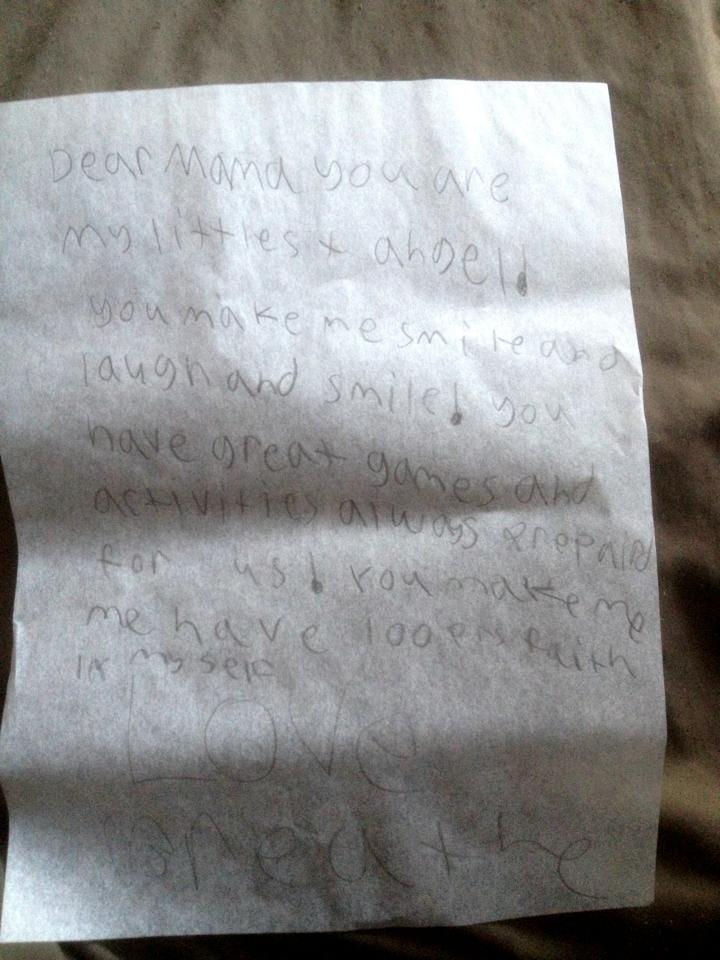 I didn’t cry until she was asleep. But that piece of paper has been at my side the rest of the evening. It has stayed within touching distance ever since she gave it to me. No love letter was ever so beautiful. Breathe told me, in essence, not only that she loves me but that she knows I love her. She feels loved. And she believes in herself. She has no idea how deeply touched I was, or am, by her letter. Of course, I hugged her and thanked her. Told her that it really meant a lot to me and that I hoped she would always tell me how she feels. But she doesn’t know that I’ve needed someone to tell me I’m loved and wanted and needed in the worst way lately. But I did. And she dd it. In her nine-year-old mind, and in Alight’s six-year-old one, Mama is the Queen. In their minds, Mama is funny, smart and beautiful. I smile gently as I write that. Mama, I realize, is everything I have ever wished to be.