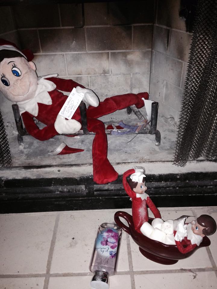 One of the memories we create at Christmastime is the adventures our elves get into. We have three main elves on the shelf: Sammy, Dash and Dasher. But we do not subscribe to the traditional story of the Elf on the Shelf. We do it differently in several key ways. First, we don’t equate getting presents with being good. We don’t mention Santa checking his list to see if they’ve been naughty or nice. And our elves do not have to remain untouched during the day because they don’t fly back to the North Pole to report on their behavior every night. I don’t give the girls gifts at Christmastime to reward behavior: I give gifts at Christmastime because I love them. Gifts cannot buy love. They cannot replace my presence in their lives. But gifts can bring joy; they can tell a child that their happiness matters and that they are special. It would not matter if my girls had a bad day during which they continually “messed up.” They would still get gifts on Christmas because I would still love them and would still want them to have a moment in which they felt spoiled and adored. So our elves are fully touchable. We’ve dressed them up in fancy suits and taken them with us to church. They’ve been stuffed in backpacks and carried in the car. They’ve been slept with. Our elves come just because Santa wants to help the girls get ready for, anticipate, Christmas morning. It’s a way of making the entire month of December extra special. So that’s the first way our elves are different.