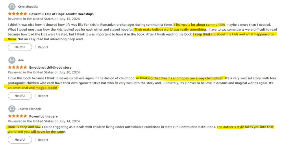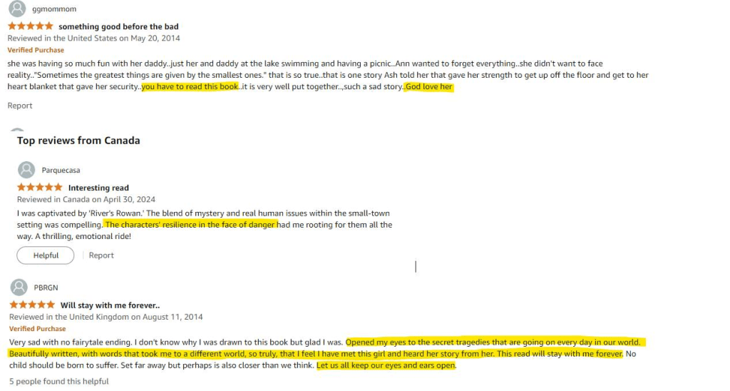 This really, really, really wrecked havoc on my confidence and on me. Frankly, it made me panic. If I cannot write, I cannot heal. If I cannot write, I cannot share, and if I cannot share then I am alienated, truly alone. If I cannot volunteer and help people, then I cannot transform something painful into something positive, and it is harder to believe I am not alone. So, I turned to the reviews and e-mails I’ve received from my “Storytimers.” If you count Goodreads, Amazon, Amazon.ca, and all the other venues, there are more than 2,000 reviews and more than half of those are 5-star. That’s more than the 5 needed to combat the 1 negative. I’m not doing this to say “look at me,” (it’s taken me years — too many years — to accumulate these reviews; it’s not that impressive); I’m doing this to show how I try to heal, and to show how much these readers matter to me.