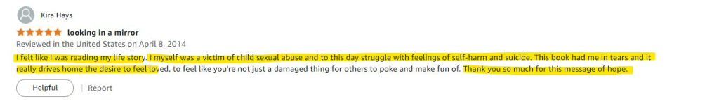 Reading these readers’ reviews and the e-mails from survivors right now helps me feel like I have permission to write. There are 2,000 reviews and, sitting in my “Storytimers” folder of my inbox, an additional 223 e-mails from the last three years alone that I can lean on.
