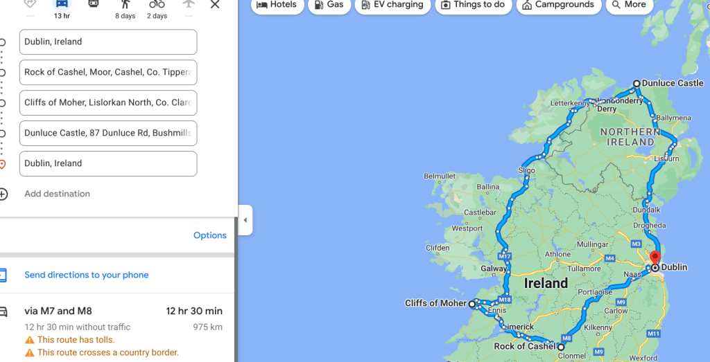 Ireland was a dream of Alight’s for a long time. She dreamed of medieval castles, soaring cliffs facing the oceans, feeling a sense of belonging with more redheads around and, generally, soaking up the friendly Irish culture. She’d listed three places she really wanted to see the most: Rock of Cashel, Cliffs of Moher and Dunluce Castle. Dunluce Castle is famous for being in several movies; Harry Potter had a scene filmed at the Cliffs and, in general, it was to be an itinerary of castles, castles and more castles. The three sites are nowhere near each other, so we rented two cars to divide the six of us up in and planned an epic road trip. The map below shows the incredible route we took, which amount to 606 miles in 3 days.