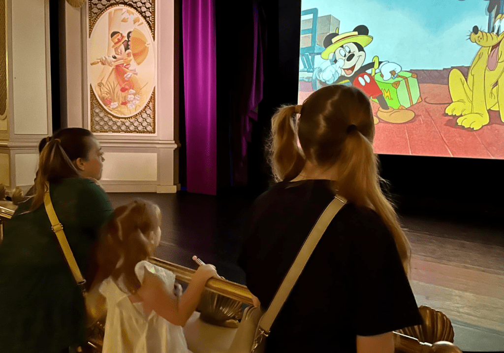 Mickey Mouse is special to Alissia. She sleeps with a big Mickey pillow. She loves this mouse. The line to meet him was 55 minutes but, true to Disney form, even the waiting had been thoughtfully planned. We passed the hour wait time by watching Mickey Mouse movies: